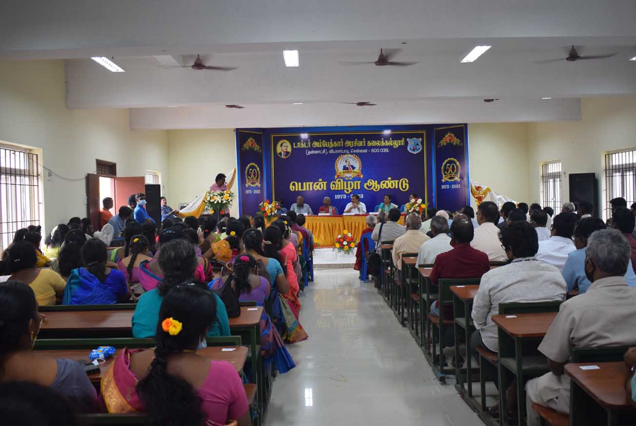 The birth of Dr. Ambedkar Government Arts College could be traced to the aspiring masses, an understanding state and a co-operative community. In the late sixties the clamour for an institution of higher education for the children of North Chennai was steadily increasing. So the Government of Tamilnadu, individual and corporate philanthropists and film stars joined hands with the common people of North Chennai to give a concrete shape to their dreams. Efforts commenced in 1971 when the Government of Tamilnadu located a huge lake lying South of Madras-Calcutta National Highway as the site for the proposed College.